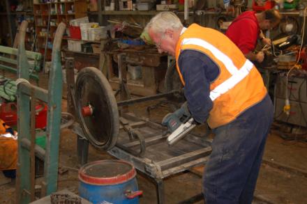 4. Brom Bromidge restoring a trolley from Axminster station with Richard Burgess busy in the background.