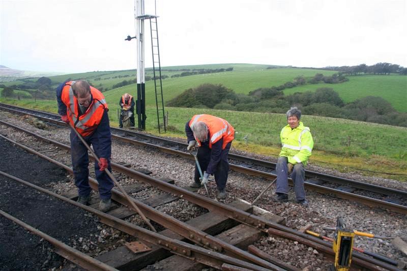2. A chance today to do some track maintenance. Pete Colley, John Villers, and Dave Evans work on a dipped crossing sleeper on the turnout leading to the transhipment siding. The sleeper was repositioned, raised, packed and tamped to remove this minor defect detected during the regular track inspections.