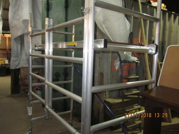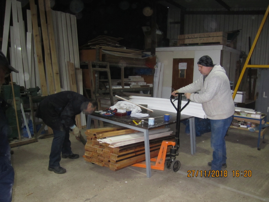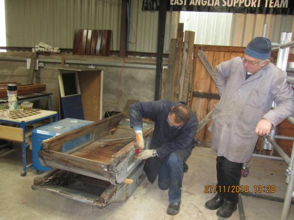6. Steve Arthurs and Dave Ely moving the carriage floorboards around our small congested workshop.