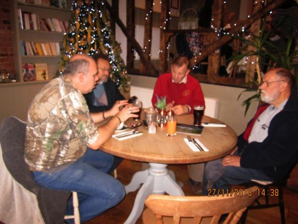 7. David Ely, Steve Arthurs, Charles Summers and John Myhill among festive decorations at the local pub for lunch and a warm-up. The workshop is unheated!