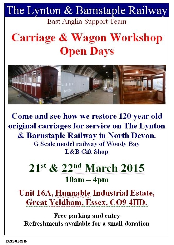 Unit No.16a, Hunnable Industrial Estate, Toppesfield Road, Great Yeldham, Halstead, Essex, CO9 4HD will be open Saturday and Sunday 21/22 March from 10am - 4pm both days when visitors will be able to view the workshop facilities and also carriage No.11
