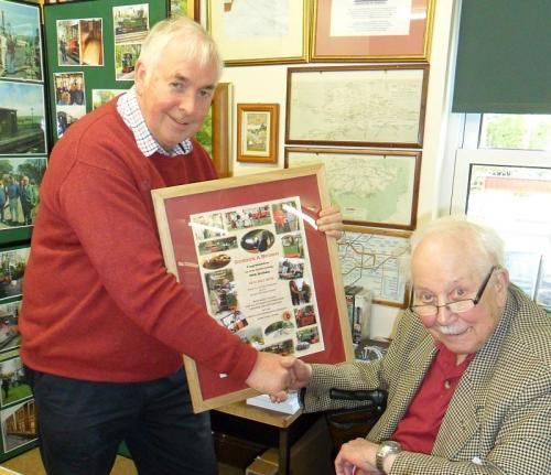 L&BR Trust Chairman Peter Miles presenting Gordon with a framed and mounted montage of photographs as a tribute to the tremendous effort he has put into supporting our railway. (photo: Geoff Kingate)